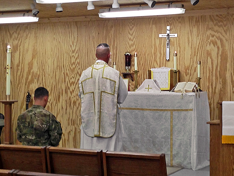El blog Rorate Caeli publicó ayer esta fotografía del P. Charles Johnson, del Cuerpo de Capellanes de la Marina de EE.UU., oficiando la Santa Misa Tridentina en su base de Afganistán, a la que suelen asistir unos quince fieles, asistido por un oficial de la Armada. El P. Johnson suele oficiar la Santa Misa tradicional por el alma de los difuntos de la Rorate Caeli Purgatorial Society.