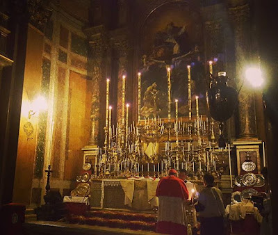 Ayer, 24 de diciembre, S. E. R. Raymond S.R.E. Card. Burke, ex Prefecto del Supremo Tribunal de la Signatura Apostólica y actual Patrón de la Soberana Orden de Malta, presidió el canto de Maitines a las 22:00 horas y a medianoche ofició la solemne Santa Misa Tridentina Pontifical "In nocte" (Misa de Gallo), de la solemnidad de la Natividad del Señor, en la iglesia de la Santísima Trinidad de los Peregrinos, Parroquia Personal dedicada a la Liturgia tradicional en Roma (Italia), a cargo de la Fraternidad Sacerdotal de San Pedro, a la que pertenecen estas imágenes. FSSP Roma y MiL.
